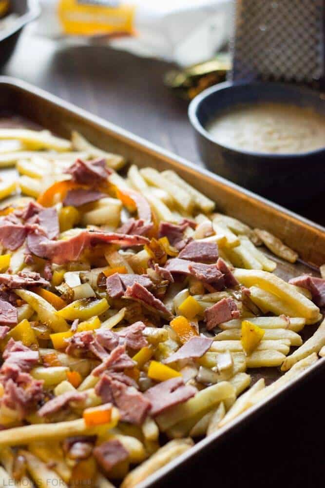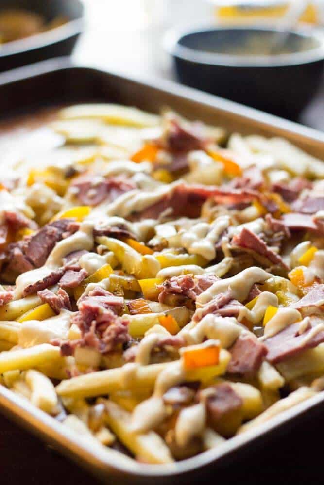 - When fries are done remove from oven, sprinkle with beef, peppers and drizzle with cheese sauce. Serve immediately.