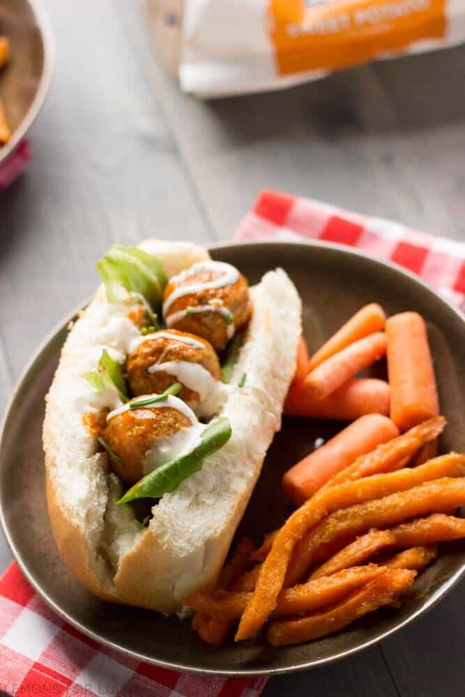 Sub shops are great, but homemade sandwiches are so much better. Smother turkey meatballs in Buffalo sauce for this twist on a meatball hoagie. Cool lettuce is tucked under each meatball and creamy blue cheese dressing gets drizzled over the whole roll. My favorite sweet potato fries from Alexia are served on the side.