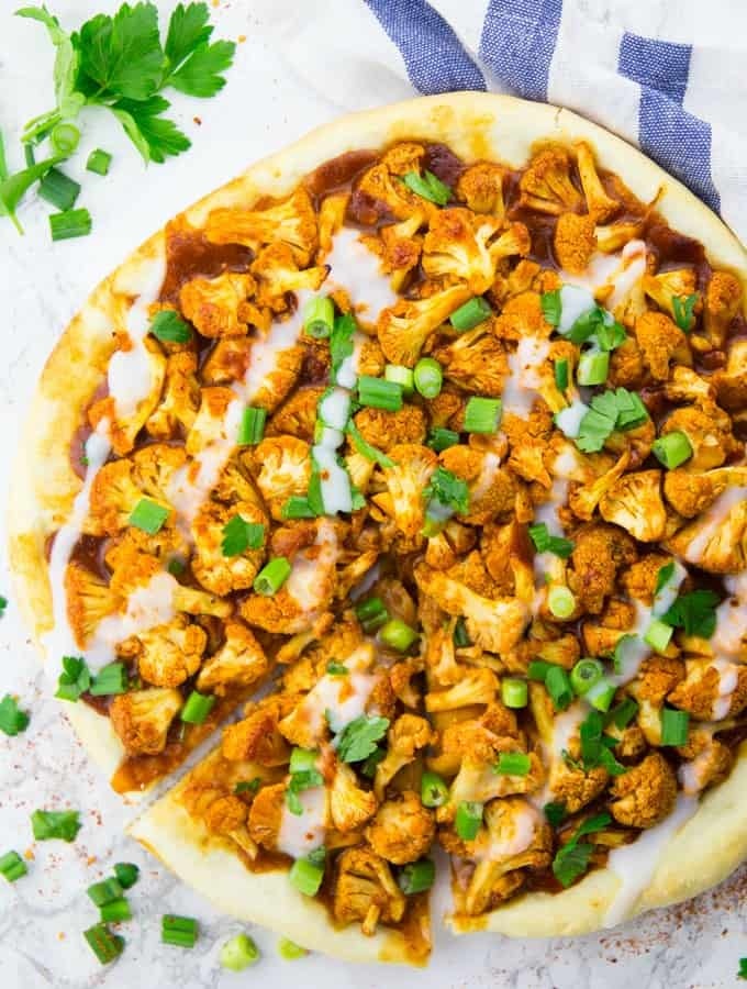 I know, there’s a lot of BBQ flavored pizza options, but they all sound great! This pizza is topped with cauliflower, vegan ranch, red pepper flakes, and cilantro.