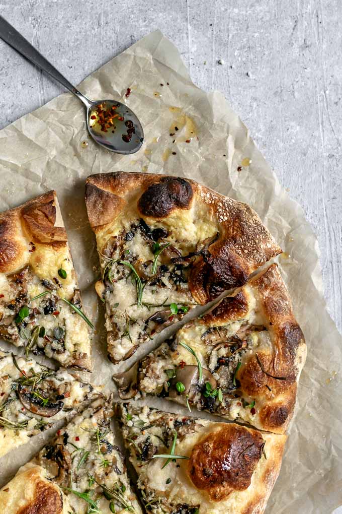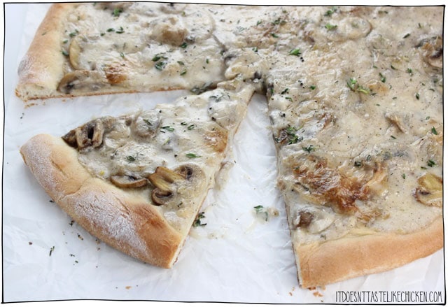 I’ve tried this vegan pizza recipe also and it’s one of my favorites! It’s made with a soft, pillowy pizza dough, topped with caramelized mushrooms, a thick white sauce, rosemary, and fresh vegan mozzarella. Instead of rosemary, I used oregano and it tasted just as delicious.