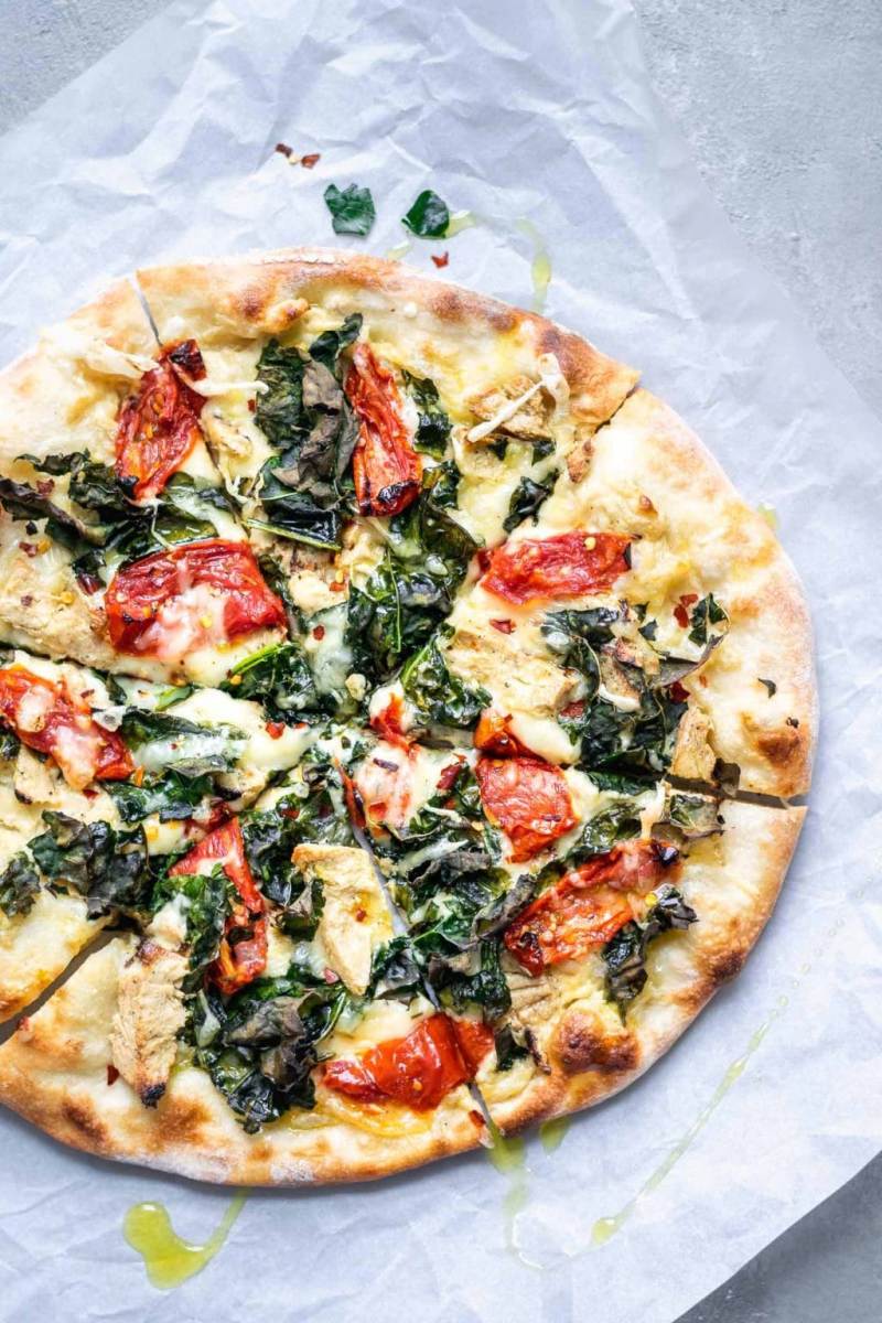 15. Crispy Kale, Roasted Tomato, and Vegan ‘Chicken’ with White Pizza Sauce