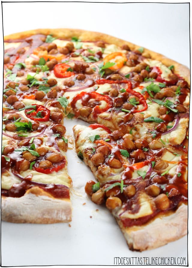 This pizza is a bit on the creative side! Instead of using chicken, the recipe uses chickpeas. This vegan pizza is topped with chickpeas, vegan mozzarella cheese (made with cashews and almonds), green bell peppers, onions, and bbq sauce.