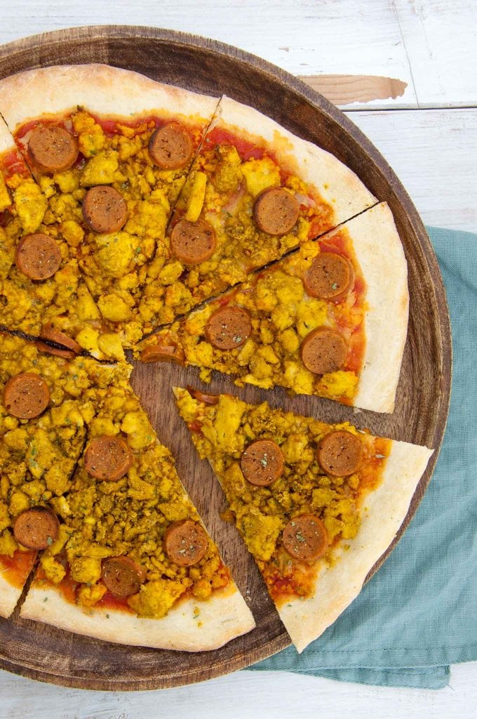 If you’re searching for a new breakfast pizza in the morning, try leaning towards this one. This breakfast pizza is topped with a soft tofu scramble, your choice of pizza sauce, and homemade seitan sausages! For those of you who don’t know what seitan is, it’s a component made of gluten wheat. Seitan is a great meat alternative. It can be used to make vegan steak, sausages, etc. (basically any vegan “meat” that comes to mind).
