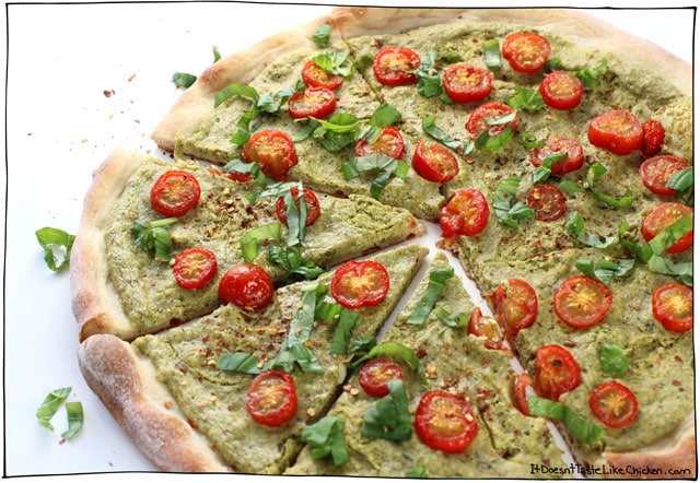 This pizza is a little different. I love pesto in my pasta, so this would be a good fit for me. This vegan pizza is topped with tomatoes, creamy pesto, and fresh basil. Do you want to know what else? It takes less than 10 minutes to prepare it!